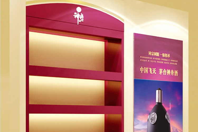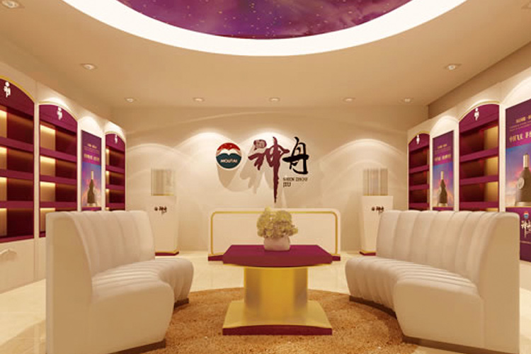 通过我们对国内同行业的了解,现阶段白酒除蓝色经典外终端形象多以红黄等传统调性为主,虽符合品质要求,但同质化严重。从奢侈品品牌给我们的提示简约、高贵,富有辉煌感。整个空间创意风格极富辉煌感,以简约时尚、辉煌的氛围渲染茅台神舟酒绽放文化,用材质的质感衬托茅台神舟酒的高端品质,以“绽放梦想,成就人生”品牌理念及太空紫的个性色彩。空间中心以天圆地方的创意承载,加入水的元素,寓意茅台神舟酒集天地之灵气、创中国优秀白酒品牌。