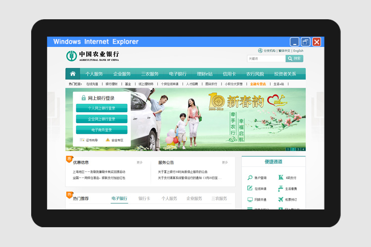 中国农业银行(Agricultural Bank of China,简称ABC,农行)是中国大型上市银行,中国五大银行之一。最初成立于1951年(辛卯年),是新中国成立的第一家国有商业银行,也是中国金融体系的重要组成部分,总行设在北京。数年来,中国农行一直位居世界五百强企业之列,在“全球银行1000强”中排名前7位,穆迪信用评级为A1。2009年,中国农行由国有独资商业银行整体改制为现代化股份制商业银行,并在2010年完成“A+H”两地上市,总市值位列全球上市银行第五位